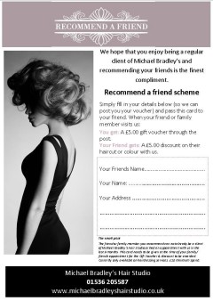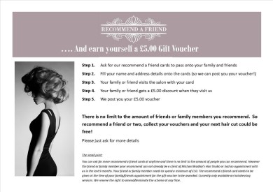 You can pick up your friend and family recommendation cards next time you are in the salon or email us your name and address and we will get some to you in the post.